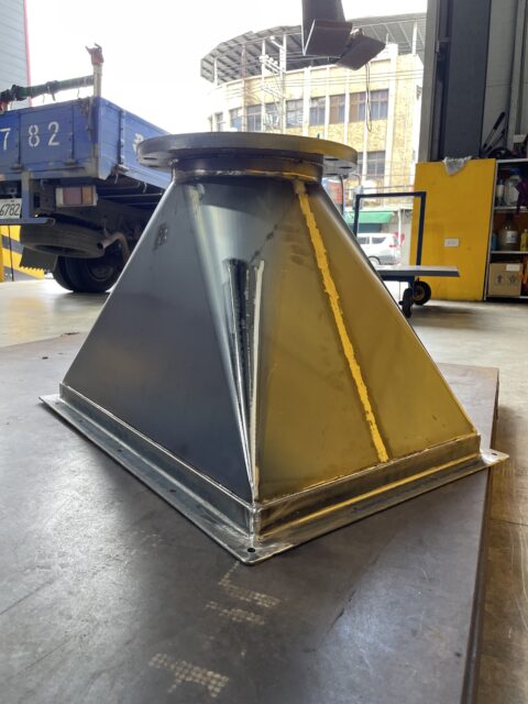In every industrial workspace, the control of unseen airflow is crucial. This project by Shangbang features an industrial exhaust transition system, crafted from thick black steel plates precisely laser-cut, shaped with smooth rounded corners, reinforced with angle steel and a top flange, and fully hand-welded into a strong, unified structure.